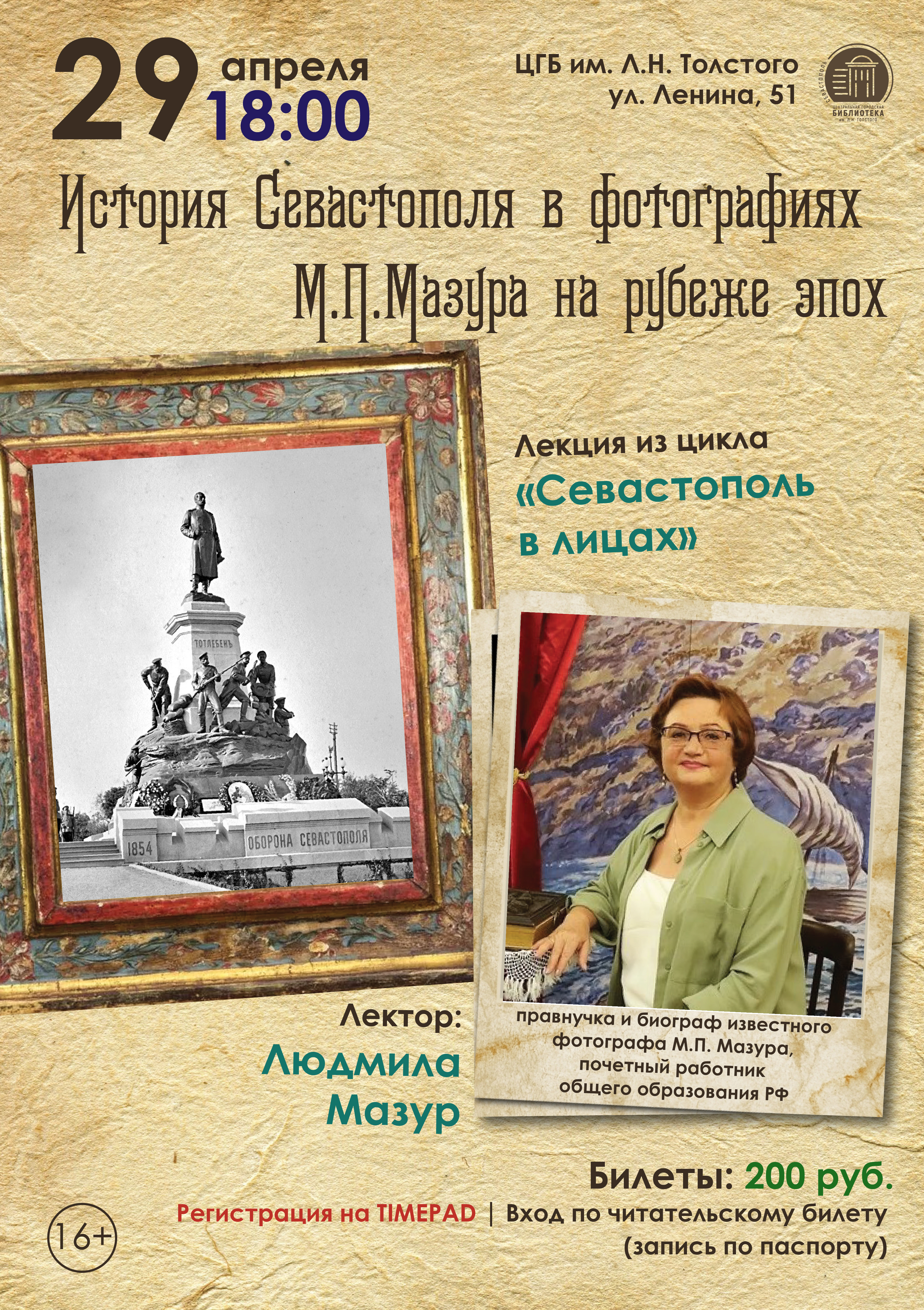 Приглашаем вас на лекцию, посвященную жизни Севастополя конца XIX — начала XX века. Вы сможете увидеть город и его жителей таким, каким его знали наши предки, погрузившись в мир старых фотографий придворного фотографа Михаила Павловича Мазура.